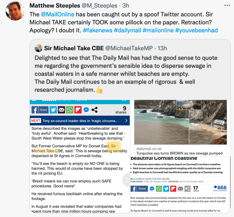 Clearly, though these ‘sources’ could be as made up as the spoof ‘Sir Michael Take CBE’ Twitter account that so successfully conned the MailOnline’s non-fact checking Elizabeth Haigh this morning (see below), things that seem unlikely do often occur in the royal family.