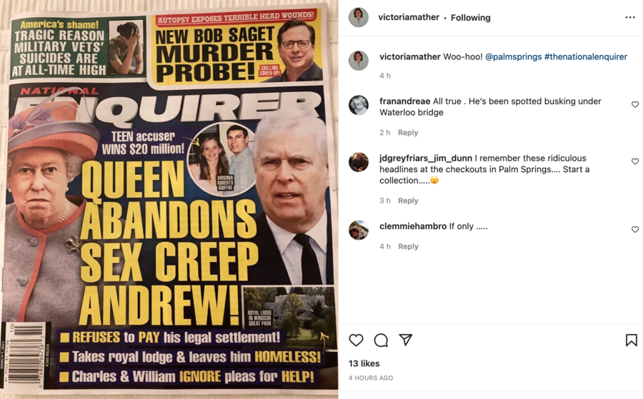 Elsewhere on Wednesday on Instagram, chief travel correspondent for Graydon Carter’s Airmail and former Vanity Fair contributor Victoria Mather posted an image of a cover of the scandal sheet that is the National Enquirer. Featuring images of Queen Elizabeth II, Prince Andrew and Virginia Roberts Giuffre, the unsurprisingly punchy headline read: “Queen Abandons Sex Creep Andrew!”