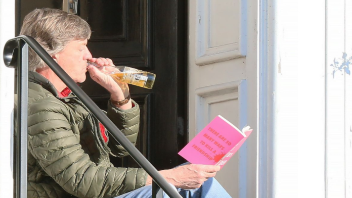 Pictured top – The pontificating presenter Richard Madeley pictured boozing from a bottle on a doorstep whilst reading a book baring the caption: “There are so many ways to kill a friendship.” Given his continually boorish behaviour, one is left asking: “Does this buffoon actually have any friendships left to end that he hasn’t wrecked already?”
