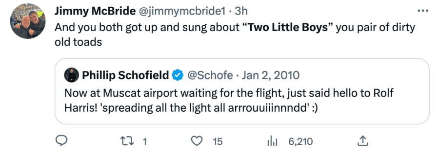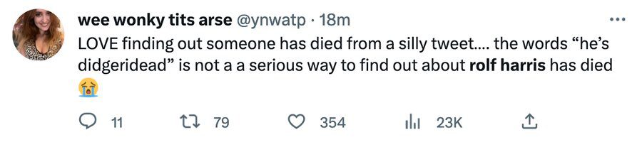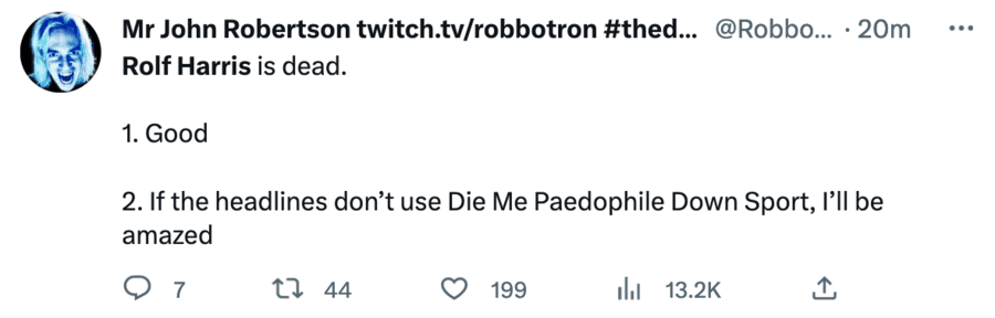 Yesterday on Twitter as news of his death was announced, Matthew Steeples issued a poll asking: “Will you mourn death of evil paedophile Rolf Harris? Equally, do you think his daughter Bindi Nicholls will come out of woodwork to claim his £££?” Still live by 10:45am on Wednesday 24th May 2024, the very, very clear majority of respondents (83.1%) not so unsurprisingly favoured the answer: “No; let him burn in hell.”