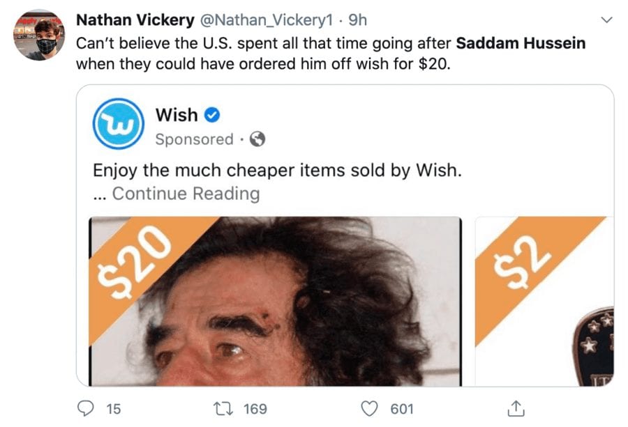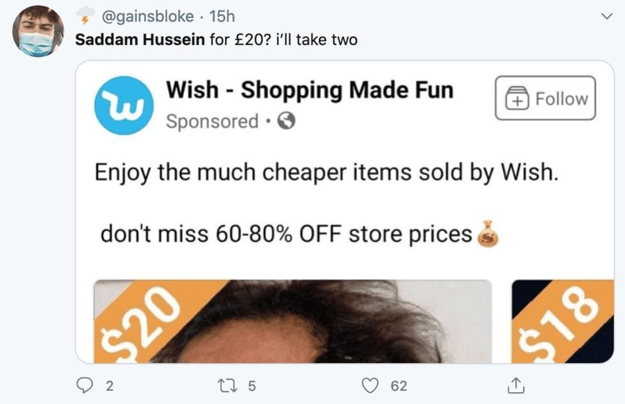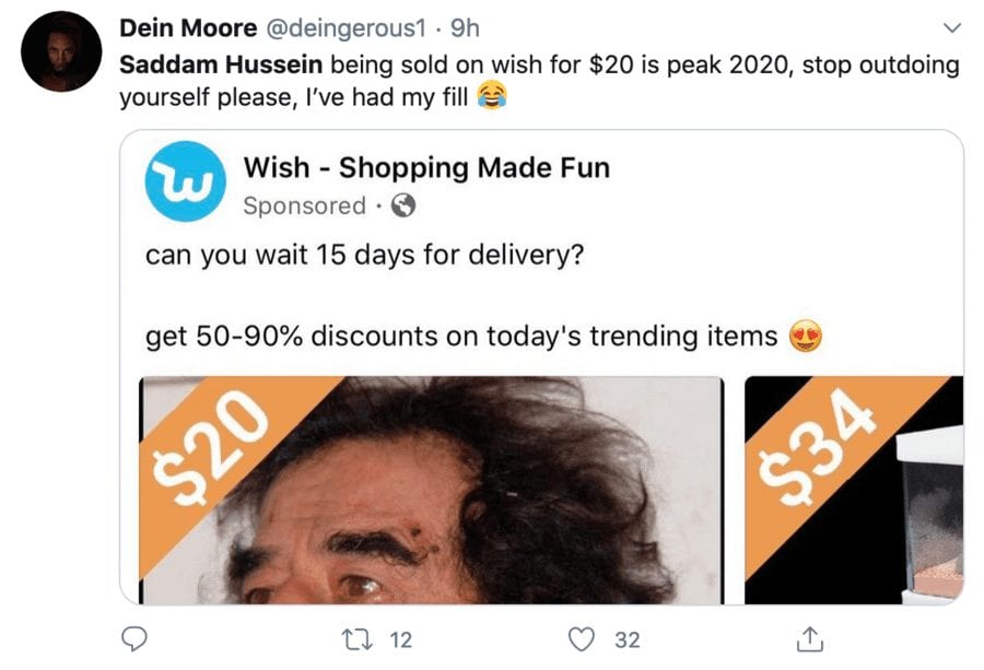Of the story, one Dein Moore remarked: “Saddam Hussein being sold on wish for $20 is peak 2020, stop outdoing yourself please, I’ve had my fill” whilst another, Nathan Vickery, added: “Can’t believe the U.S. spent all that time going after Saddam Hussein when they could have ordered him off wish for $20.”