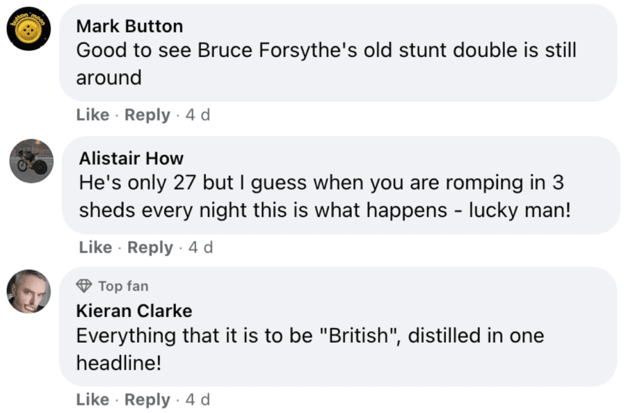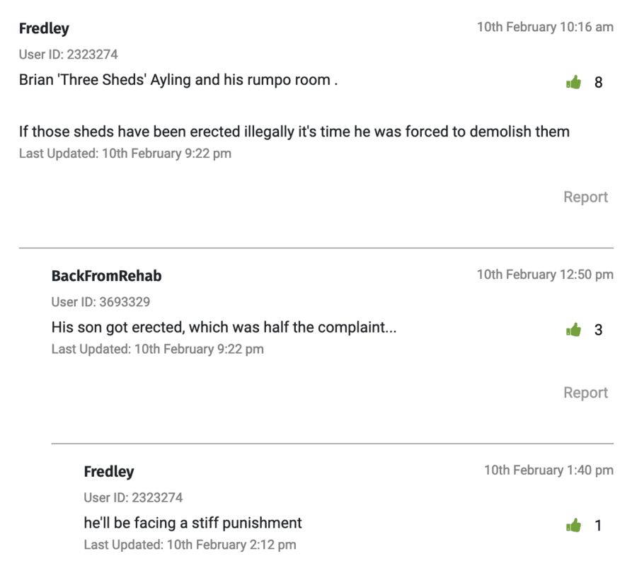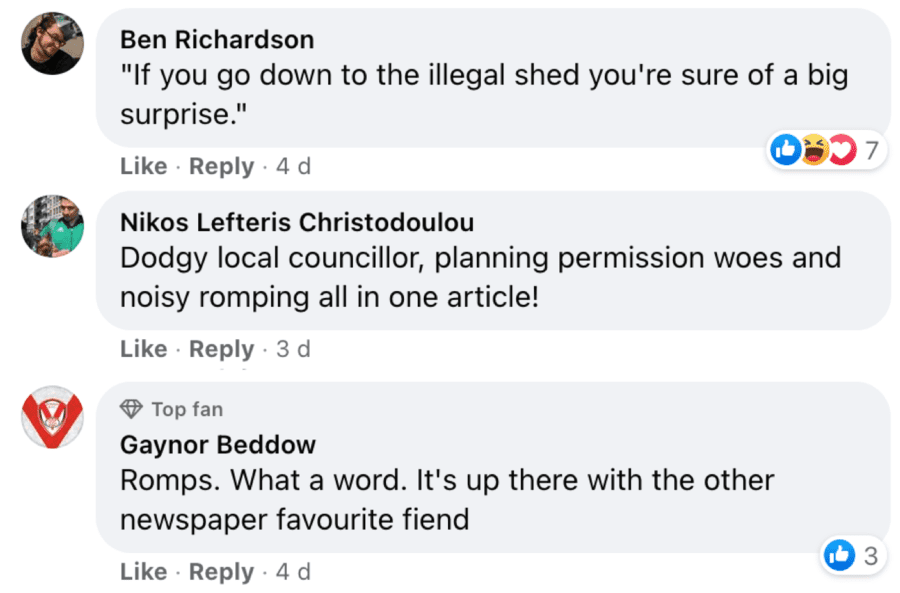 Sharing news of a not-so-neighbourly dispute that subsequently featured on the Facebook Group Angry People in Local Newspapers, Sexton began: “A councillor who built three sheds [complete with “fire hazard” “dodgy wiring”] without [planning] permission in his garden and let his son live in one has been facing complaints from neighbours over amorous trysts.”