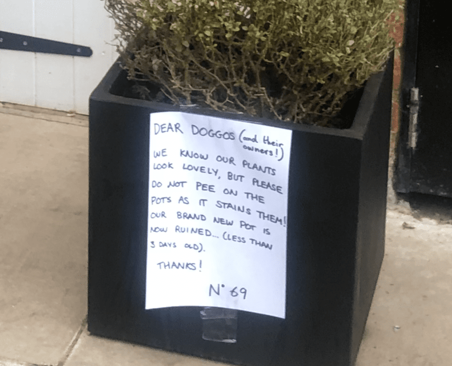 Secondly, attached to a plant pot is another sign that reads: “Dear Doggos (and their owners!) – We know our plants look lovely, but please do not pee on the pots as it stains them. Our brand new pot is now ruined… (Less than 3 days old). Thanks! No. 69.”