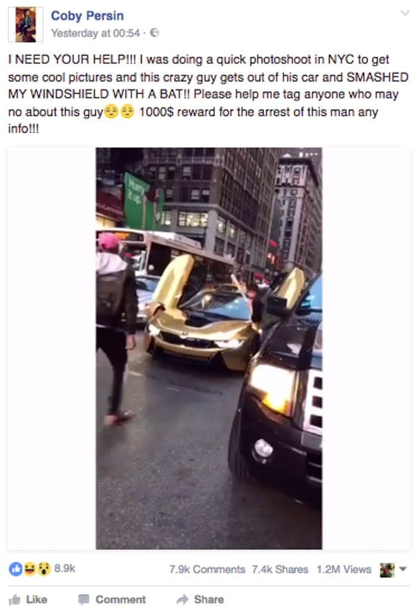 In a 41 second clip, Persin was filmed with his hideous gold wrapped BMW in New York doing what he describes as “a quick photo shoot to get some cool pictures” whilst inconsiderately blocking a lane of traffic. Posing like the true prat he plainly is, this “YouTube star” is then interrupted by a man with a baseball bat who proceeds to smash the vehicle and then walk off.