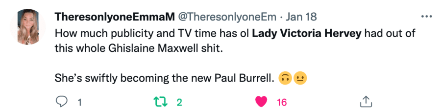 ‘Simple Sarah’ and ‘Angry Andy’ could also turn to Ghislaine Maxwell, but she’s currently rather incoveniently incarcerated. They do have the options of the “Chanel-clad” Baroness Meyer, but she’s probably busy post-charity-tinpot-banging pompously pontificating in the House of Lords and then there is the disgraced ex-Bell Pottinger honcho James Henderson. They do say “people’s choices of friends reflect their own characters” and this lot certainly are a very curious mirror one could argue.After another of ‘Randy Andy’s’ equally stupendously stupid chums Lady Victoria Hervey appeared on ITV to defend him – she ridiculously remarked: “‘At the end of the day, he’s only a man, and he’s male, right? I don’t think anyone can expect him to just be a monk in a monastery” – Twitter users quite rightly mocked and condemned her. In a tweet, one user suggested her to be “swiftly becoming the new Paul Burrell.” Perhaps the Duke of York and Sarah, Duchess of York should move this ‘Twit Girl’ into Royal Lodge, Windsor. In exchange for free lodgings, Lady Victoria could be put to work doing hoovering (of the domestic variety).