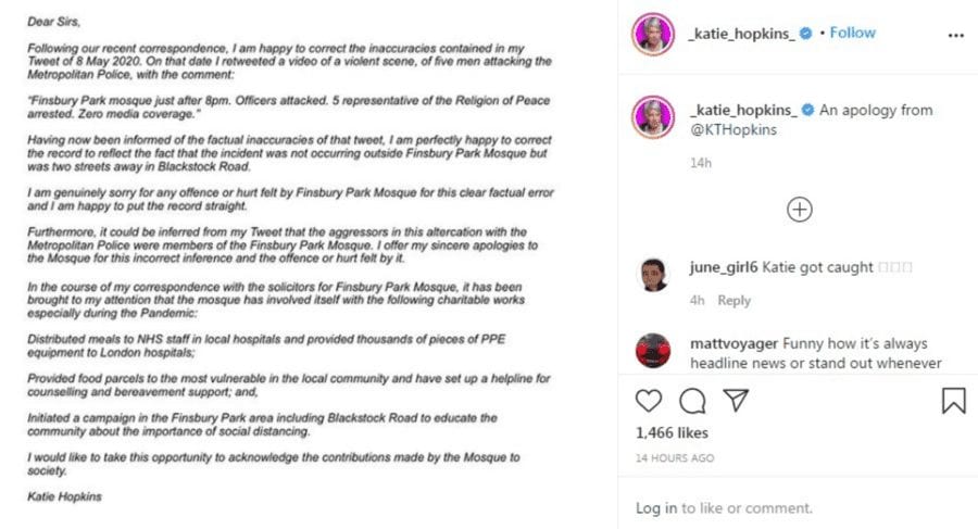 Katie Hopkins’ sphere of influence has extended too far for too long and that she was forced to apologise for a false tweet about the Finsbury Park Mosque yesterday was quite correct.