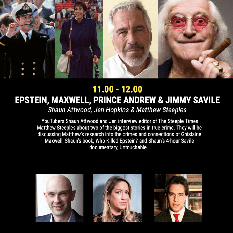 Continuing exploration of such matters, The Steeple Times’ Matthew Steeples will spend an hour discussing his research into the crimes and connections of not only Jeffrey Epstein but also Ghislaine Maxwell at CrimeCon UK in London on 12th June with YouTube True Crime Channel host and author Shaun Attwood and his podcaster co-host Jennifer Hopkins.