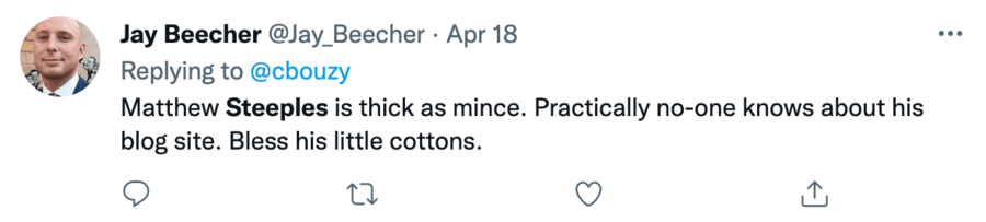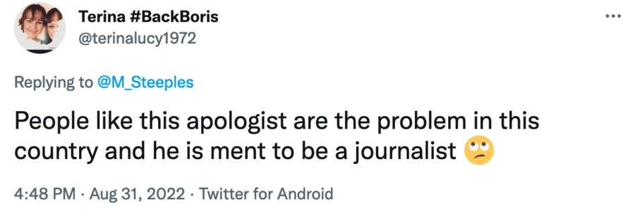 In the hours that followed, after calling out one particularly obnoxious woman believed to be called Lucy Terina (whose mangled missives are shared below along with those of ‘Sussex Squaddie’ leader Christopher Bouzy), Robinson’s ranters bombarded me with hate and suggested all kinds of nonsense. In doing so, however, all they did was illustrate to anyone rational that Twitter is simply an echo room where those that shout loudest simply make the biggest berks of themselves.
