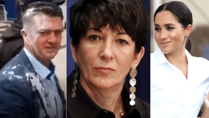 Pictured top (left to right) – A covered in milkshake Tommy Robinson, a contemplative Ghislaine Maxwell and a seriously smug Duchess of Sussex.