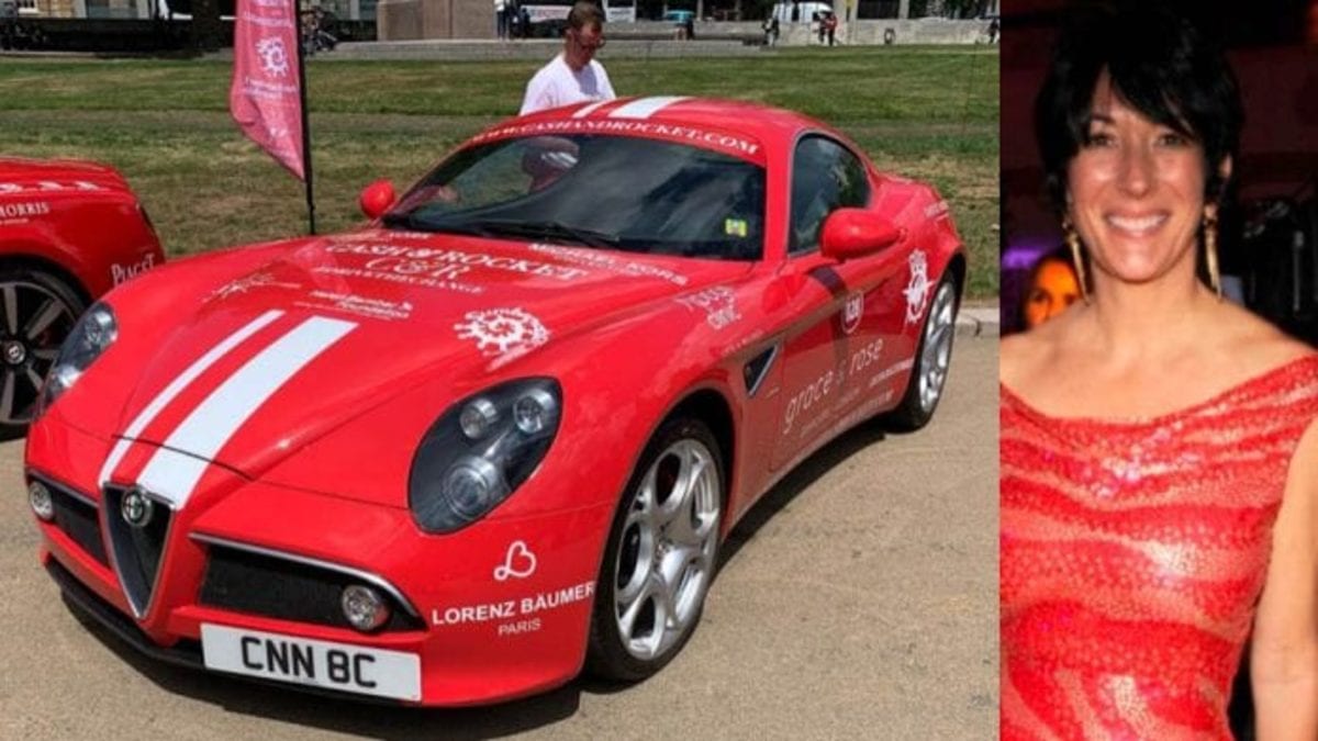 Pictured top: A photograph taken by ‘The Steeple Times’ on 13th June of the Alfa Romeo Ghislaine Maxwell co-drove and an image of her in the charity’s colours (right).