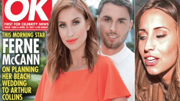 Pictured Top – Ferne McCann and Arthur Collins sold news of their impending-never-to-happen wedding to ‘OK!’ in April 2017 (left) just days before Collins went on the rampage chucking acid over innocent people in a nightclub; later this washed-up-wastrel woman was snapped smashed-off-her-skull (right).
