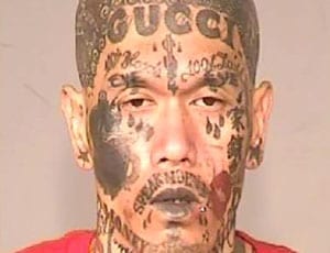 With a face covered in tattoos – including the words “Gucci”, “Speak No Evil” and “Money” – this Fresno, California based man was arrested on Monday on numerous felony charges, including being a felon in possession and cultivation of marijuana.