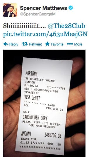 Whether it was his bill or someone else’s, the vulgarity of the 25 year old Made in Chelsea participant Spencer Matthews tweeting an image of a receipt for £488,706.08 is yet another example of distasteful excess.