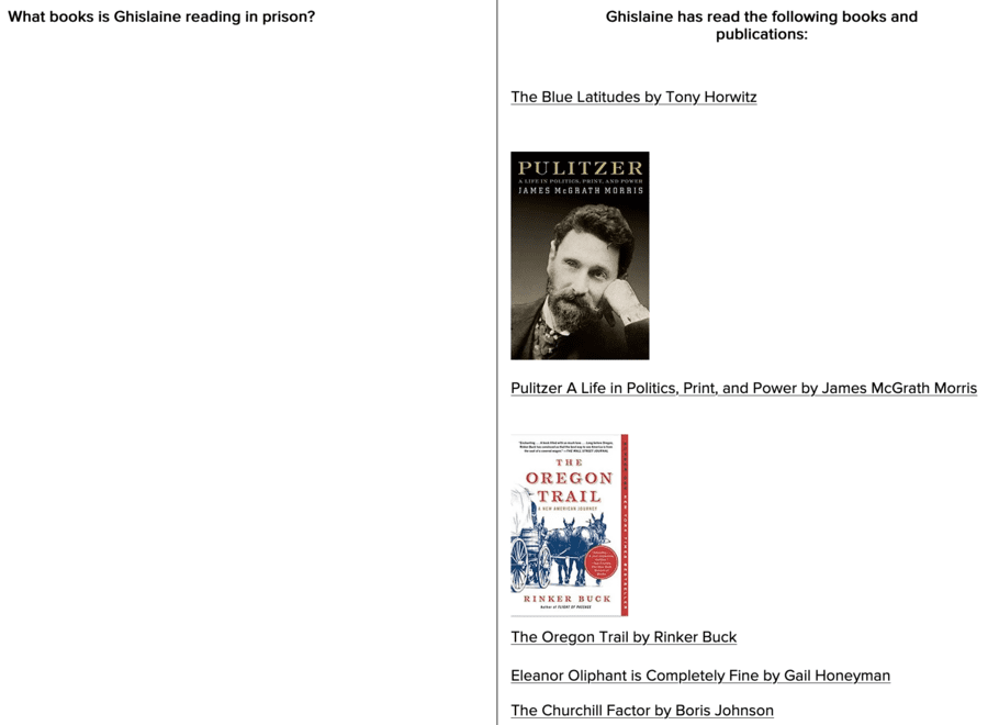 Continuing of Jeffrey Epstein and Prince Andrew’s former ‘bestie’ – a woman they remarkably declare to be driven by “kindness, generosity… honesty and integrity” and “compassion” even – the website even goes as far as to share what Miss Maxwell is reading in prison (when she’s supposedly not recovering from being “worn out” from studying the 2.7 million pages of evidence against her).