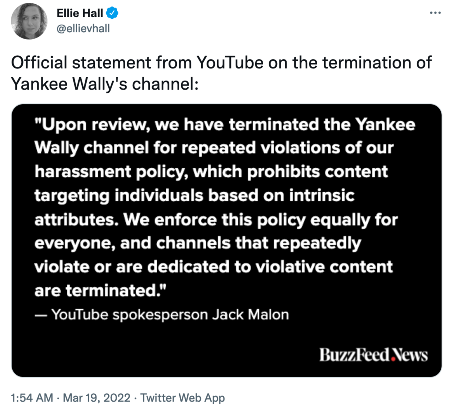 According to joker-not-a-journo Hall, a clearly woke spokesman for YouTube named Jack Malon told her: “Upon review, we have terminated the ‘Yankee Wally’ channel for repeated violations of our harassment policy, which prohibits content targeting individuals based on intrinsic attributes. We enforce this policy equally for everyone, and channels that repeatedly violate or are dedicated to violative content are terminated.”