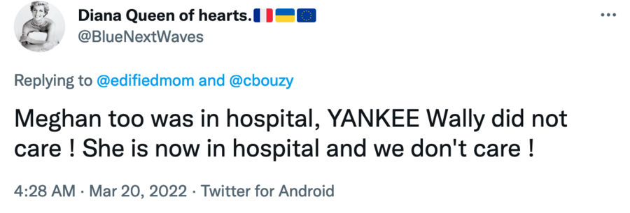 Meghan Markle bullies ANYONE who dares disagree with her or calls out her evil lies. Bouzy is a racist bully who attacks elderly disabled women with his constant lies. She lies and says women need to use their voices then she shuts other women from having voices. Bouzy is evil and so is Meghan. Hateful narcissistic people both of them.