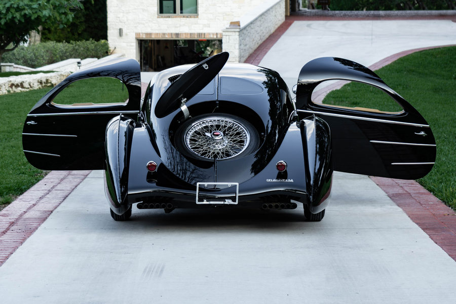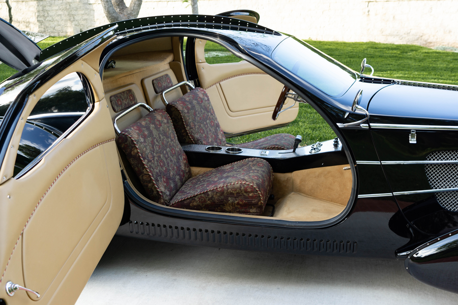 The “reimagined Atlantic” concerned was made by Cook’s firm, Delahaye USA, in 2016 and is described as “noticeably longer than the original, 10 inches to be exact.” It has a 127-inch wheelbase and features a BMW fuel-injected 12-cylinder engine and automatic transmission and unlike its forerunners comes equipped with air conditioning, heating and power windows. The stainless steel tubular seat frames are exact copies of those from the 57SC now owned by Ralph Lauren and the fabric is described as “richly decorative.”