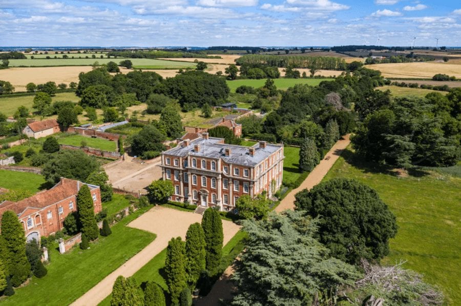 Knight Frank market the 34,928 square foot freehold property as a whole or in three lots complete with 75 acres. They describe the mini-estate as including “beautiful formal gardens, a ‘3 sided’ lake, a walled garden, woodland walks, a Grade II* dovecote and farmland.”