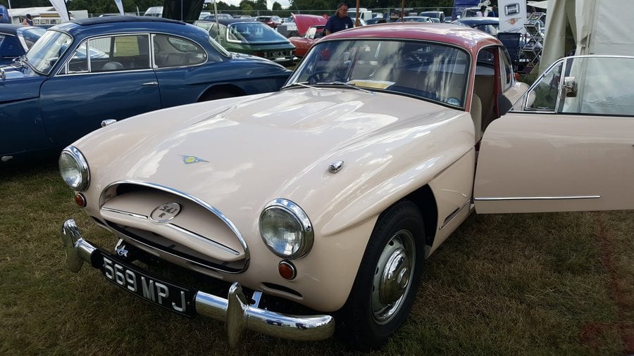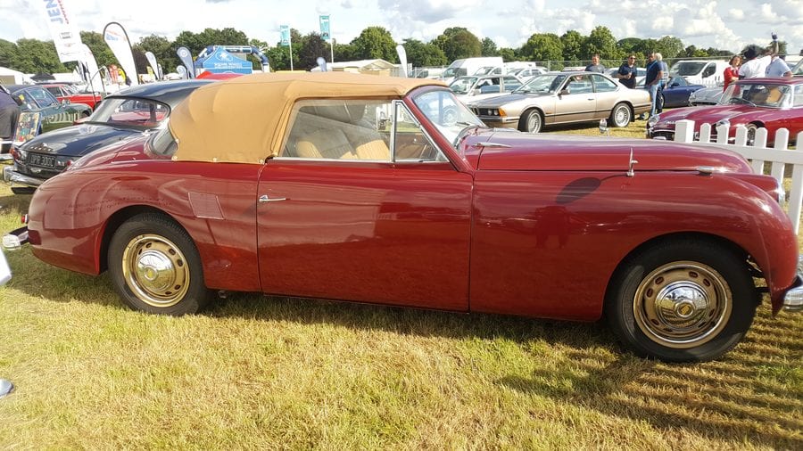Between 1950 to 1958 only 88 of these early Interceptors were built. This particular 1954 model was the first British car to be produced with metallic paint and a vinyl roof. You thought vinyl came of age in the ’70s TV The Sweeney era? This car was painstakingly rebuilt from the chassis up over 15 years from 2000. It was rescued back from California where it was on the point of being scrapped. It has an aluminium body but the boot lid was the first panel Jensen produced in fibreglass. A 4-litre engine powers this solid-looking drive. A lighter looking version was later sold at the Austin A40 Sports.