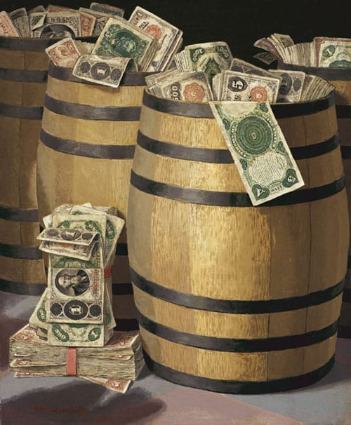 Painted by the banker turned thief turned artist Victor Dubreuil, whose News of All the World canvas we featured last year, this oil on canvas has been signed twice by the artist and was painted between 1886 and circa 1900. Considered an example of counterfeit currency, works by Dubreuil were confiscated by the American Secret Services in the 1890s and of the other known dozen Barrels, one can be found in the Federal Reserve Bank Collection.