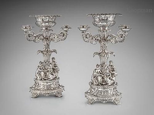 A magnificent pair of candelabra by Paul Storr of London and made in 1822, The Sampaio Service formed part of an extensive service for 180 persons and is described as representing “one of the most elaborate and important productions” by this renowned silversmith. Its first owner, Henrique Teixera de Sampaio (1774 – 1833), was a wealthy merchant who later became Portuguese Minister of Finance and then President of the Exchequer.