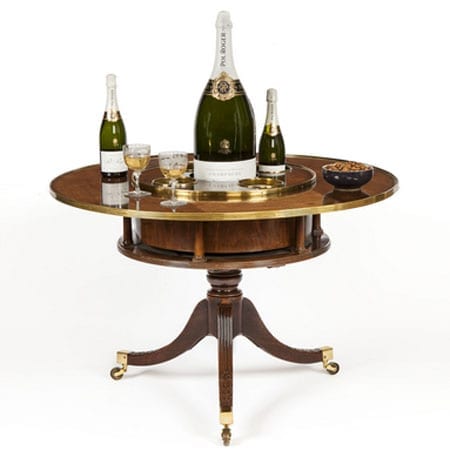 A true conversation piece by George Hepplewhite, this rare table – made circa 1800 – is perfect for sociable sorts and was designed with drinkers in mind. The Pol Roger pictured with it is included.