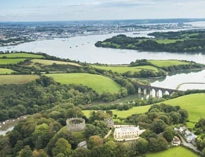 “One of the most superb views of Cornwall, a Brunel stone viaduct crossing a foreground creek, the Lynher and Tamar estuaries beyond, and the wooded slopes of Anthony”.