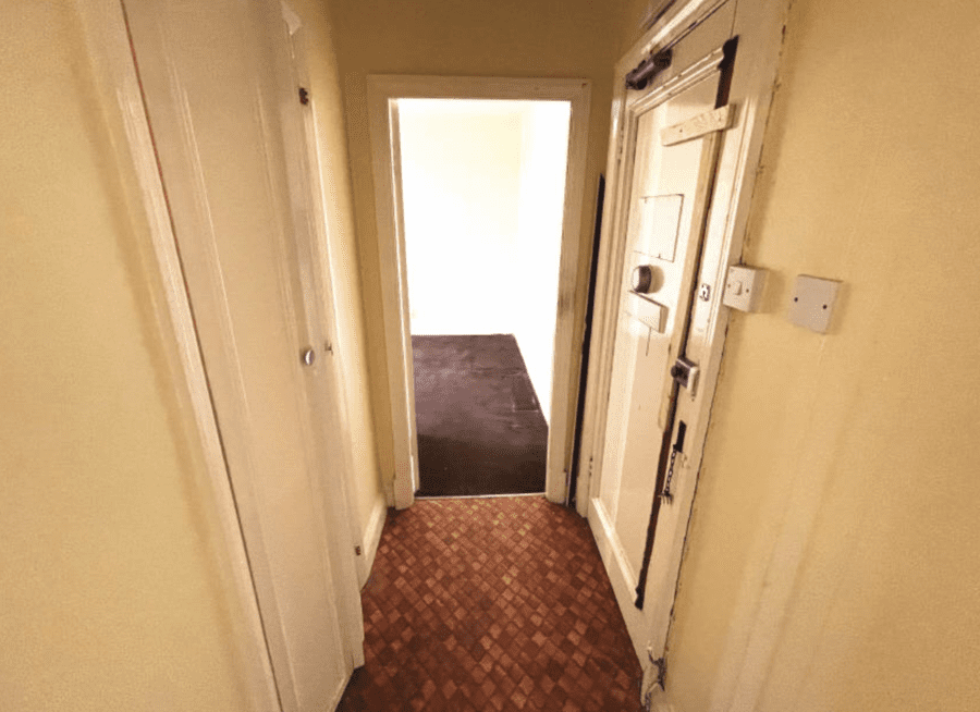 Described as “requiring modernisation,” the third floor flat includes an entrance hall, small kitchenette, sitting room, bedroom and en-suite shower room. It is situated at the corner with Burnsall Street and above the Snappy Snaps shop.