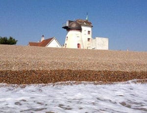 Converted windmill requiring renovation on the beach at Aldeburgh in Suffolk for sale for £1.2 million