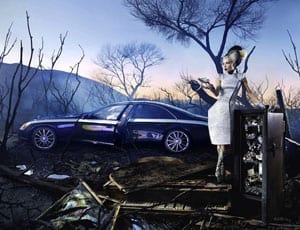Here, therefore, we feature a picture of a Maybach in a burnt out woodland setting complete with a Lady Gaga lookalike. We declare it The Steeple Times picture of the week.