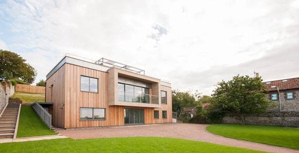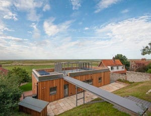 “Built to optomise the spectacular views over the saltmarshes” from Wells-next-the-Sea through Blakeney Point to Salthouse, this environmentally sustainable 2,290 square foot contemporary house includes 2 large reception rooms, 5 bedrooms and 3 bathrooms. The best feature of the building, however, is a sky bridge that leads to a vast roof terrace and covered balcony.
