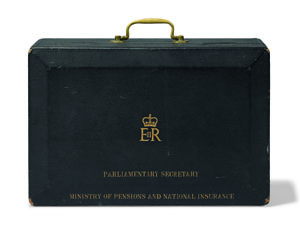 Made by Barrow, Hepburn & Gale, this black canvas simulated leather travel dispatch box was used by Margaret Thatcher between 1961 and 1964. It is gilt embossed and features the cypher of Her Majesty Queen Elizabeth II above the words: “Parliamentary Secretary Ministry of Pensions and National Insurance”.