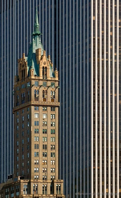 “What pushes The Sherry Netherland to the top, of course, is its top – a soaring, elaborate minaret with delicate open widow’s walk atop an asymmetrical roof reminiscent of French châteaux, all in delightfully green aged copper. The asymmetrical form of the tower significantly improves its aesthetics from most angles and if it had been a square tower it would be just another great campanile, but not a visual force with which to be reckoned. The top’s chimneys and large protruding gargoyles, furthermore, grasp and tame the sky like some giant’s gnarled fist”.
