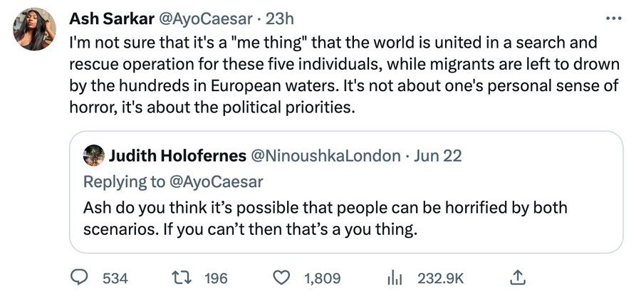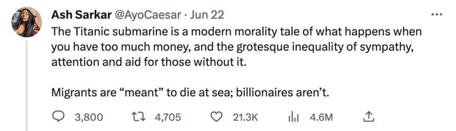 “The Titanic submarine is a modern morality tale of what happens when you have too much money, and the grotesque inequality of sympathy, attention and aid for those without it.  Migrants are ‘meant’ to die at sea; billionaires aren’t.”