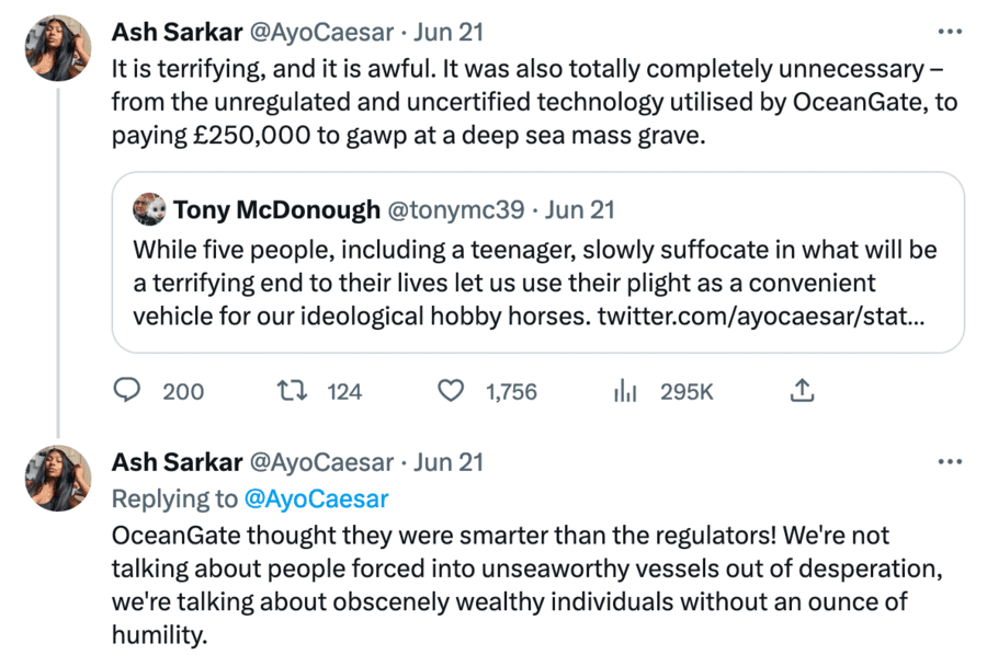 Ash Sarkar was once described by fellow journalist Dan Wootton as “grasping” and today Matthew Steeples asked of her on Twitter: “Was Ash Sarkar @AyoCaesar right to suggest those 5 souls who so sadly died on Titanic submersible were an example of a ‘modern morality tale of what happens when you have too much money’?” By 12 noon on Friday 23rd June 2023, the majority of respondents favoured the answer:  “No; she is mental and evil.”