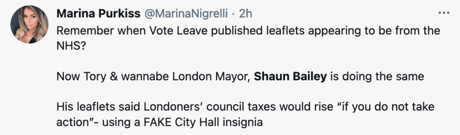 (Yet More) Bollocks from Bailey – Lawyers acting on behalf of Labour, in their submission to the Crown Prosecution Service, called leaflets distributed by Bailey’s campaign team in December a “fraudulent device,” as described by the 1983 Representation of the People Act.(Yet More) Bollocks from Bailey – Marina Purkiss compared Shaun Bailey’s decidedly dodgy leaflets to those of Vote Leave’s fake news NHS ones.