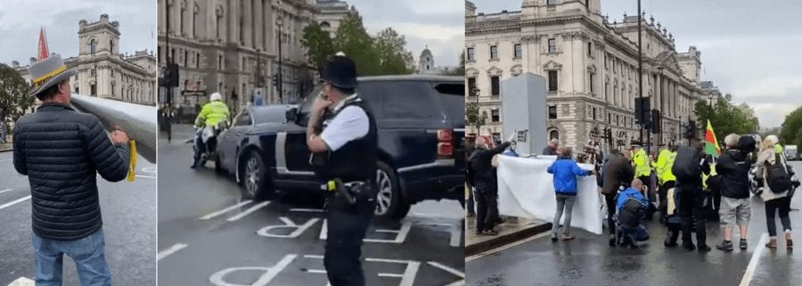 Steve ‘Stop Brexit’ Bray captures Prime Minister Boris Johnson’s Jaguar limousine getting rear-ended by his security Range Rover in Parliament Square