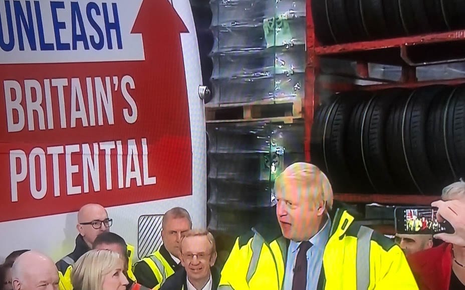 Pictured top: Boris Johnson’s backdrop was a heap of tyres and a bus emblazoned with the ludicrously preposterous (and totally unachievable by him) tagline: “Unleash Britain’s Potential.”