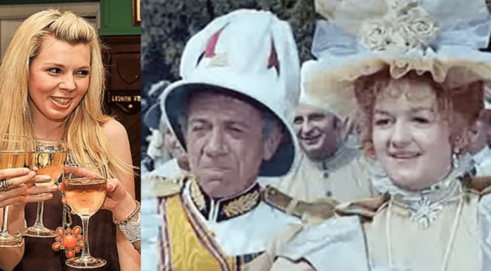 Pictured top – Carrie Johnson in her younger days carrying on and boozing for Britain (left); Sid James and Joan Sims in ‘Carry On Up the Khyber’ (right).