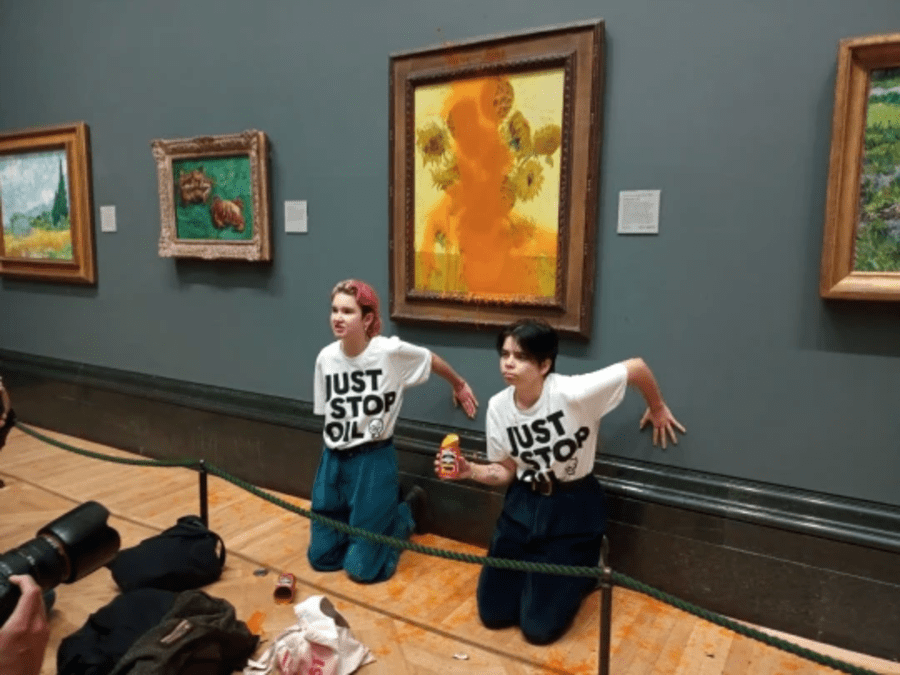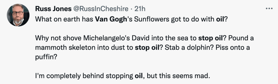 “What on earth has Van Gogh’s ‘Sunflowers’ got to do with oil? Why not shove Michelangelo’s ‘David’ into the sea to stop oil? Pound a mammoth skeleton into dust to stop oil? Stab a dolphin? Piss onto a puffin? I’m completely behind stopping oil, but this seems mad.”