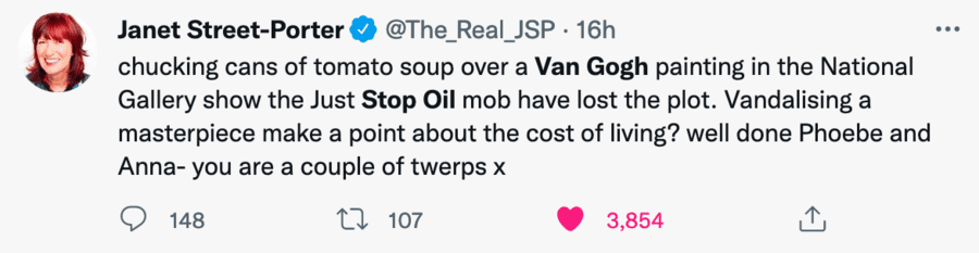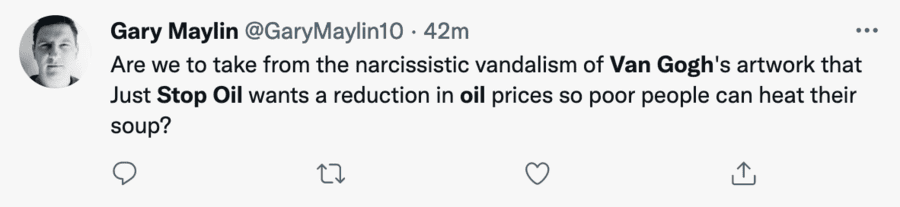 The Just Stop Oil ‘protestors’ who attacked a Van Gogh yesterday should be branded as what they truly are: Moronic vandals; that their organisation is funded by a member of the Getty family is even more outrageous