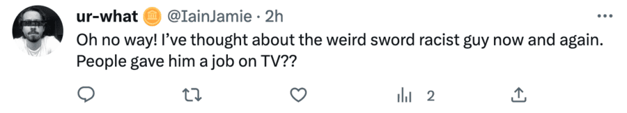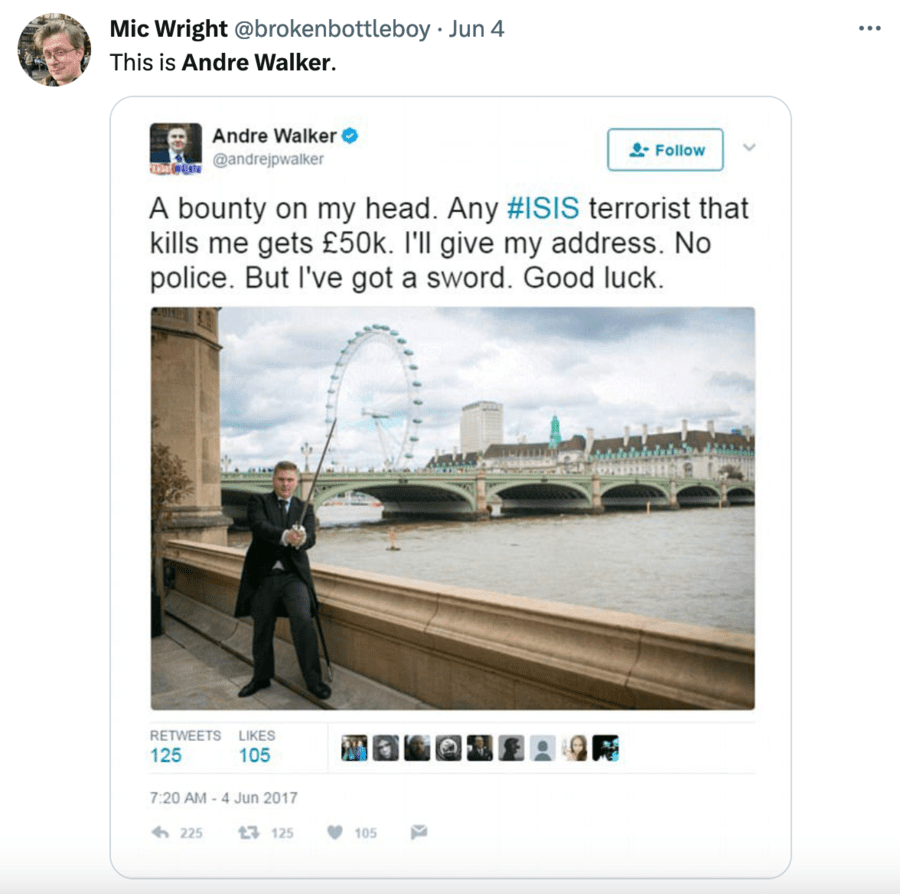 At that time, Walker showed himself as beyond shockingly stupid when shared an image of himself wielding a sword on a terrace at the Palace of Wesminster. Accompanying it, he tweeted: “A bounty on my head. Any #ISIS terrorist that kills me gets £50k. I’ll give my address. No police. But I’ve got a sword. Good luck.” Quite rightly universally condemned and called out as an irresponsible moron, this noxious nitwit subsequently moved on from his New York Observer column for Kushner to now hosting a show on the Rupert Murdoch owned Talk TV.