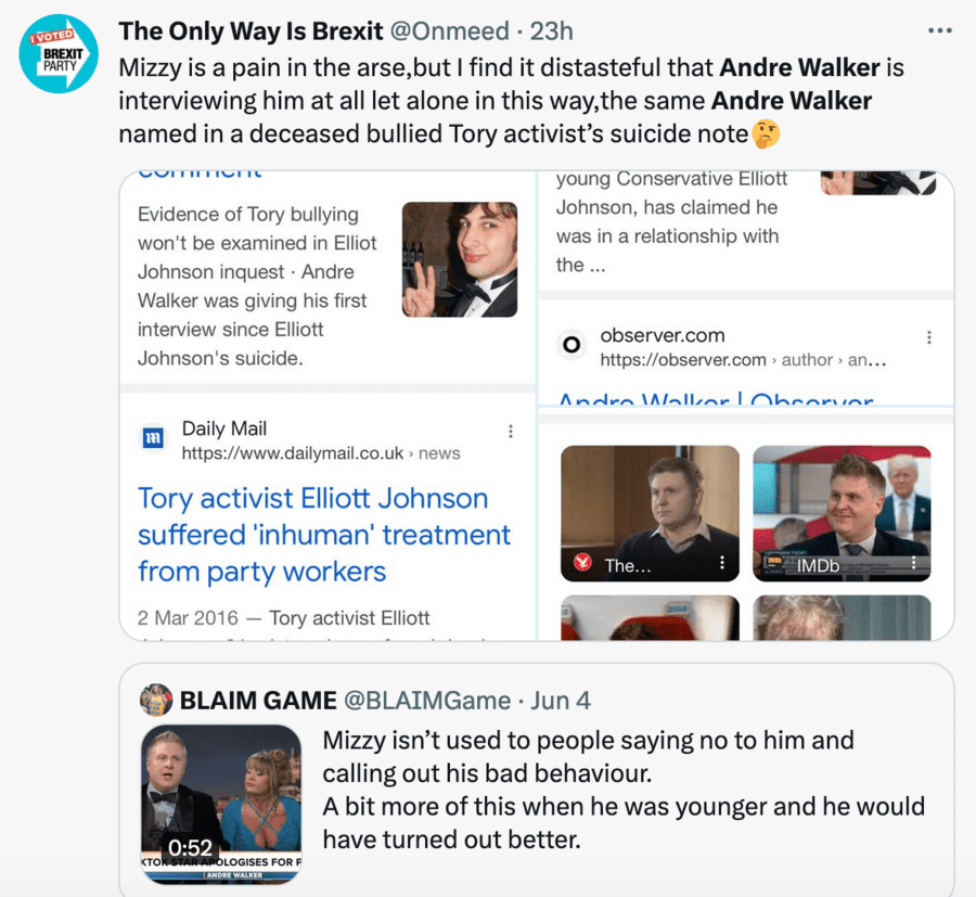 Far-right provocateur Walker – whose career ‘highlights’ have included being forced to resign as a political aide after being exposed smearing colleagues in 2010 and for his connections with the Tatler Tory Mark Clarke and events that culminated in the suicide of another activist named Elliott Johnson in 2015 – himself went viral ‘Mizzy-style’ in June 2017.