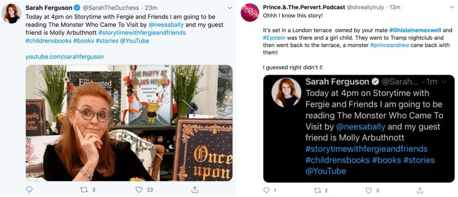 Sarah Ferguson – a woman whose non-sweating ex-husband counted a monster paedo as his friend – deservedly slammed as she announces she’s going to be going online to read ‘The Monster Who Came to Visit’