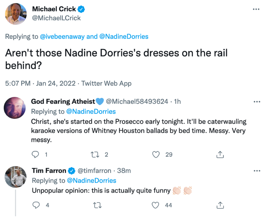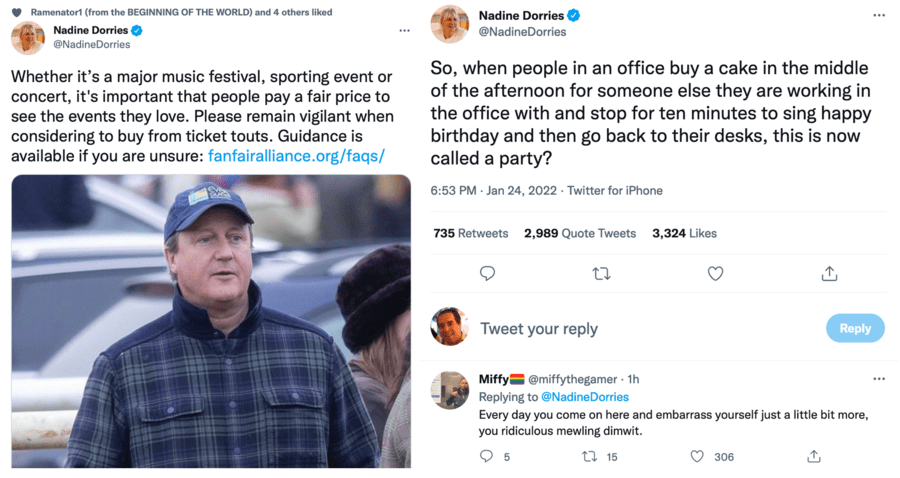 Nadine Dorries took to Twitter on the afternoon of Monday 24th January 2022 to first mock David Cameron and accuse him of being a ticket tout and then returned later on to attempt to defend the latest allegations against Boris Johnson’s partying at Downing Street. Given she is a government minister, how does she have time for such activities?The Member of Parliament for Mid Bedfordshire has repeatedly shamed herself previously. In 2012, this obnoxious woman was suspended from the Conservative Party after taking money to appear on ‘I’m a Celebrity… Get Me Out of Here!’ without informing the chief whip; later, first in July 2019 and then secondly in September 2021, Boris Johnson promoted this brainless berk.