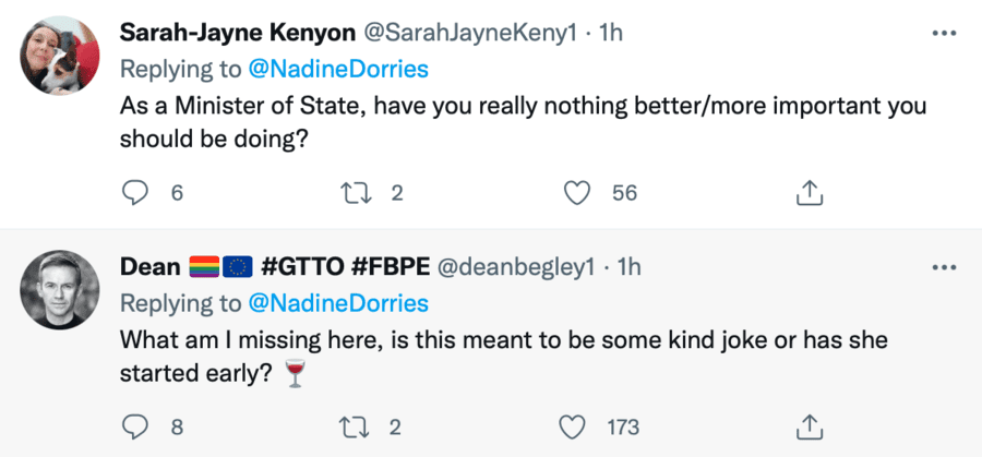 Tory twerp and gormless government minister The Rt. Hon. Nadine Dorries MP brings shame on the Tories through her irresponsible tweeting