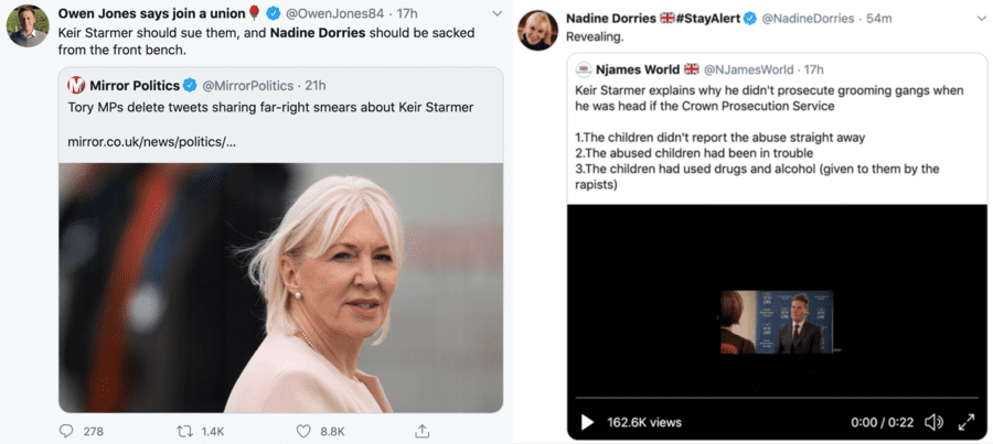 Quick to demand others correct, their errors – in August 2019, for example, Dorries herself tweeted: “I hope all those who gleefully flew to the keyboard and typed out #porkies in an attempt to traduce the reputation of our PM @BorisJohnson are as quick to bang out an apology and put the record straight” – Dorries, currently a health minister for patient safety, suicide prevention and mental health, used Twitter to share a doctored far right video. It had been falsely manipulated to make it look like the new Labour leader knew about child abuse and did nothing whilst head of the Crown Prosecution Service and though she’s deleted it, she hasn’t even issued a public apology.