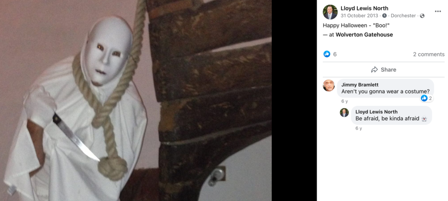 Elsewhere, in a post on Facebook, shared on 31st October 2013, Mr North – who has worked as British Airways steward, according to FTHN and posed in an outfit where he displayed a “passing resemblance to Baroness Thatcher” also – offered up a photograph of a person with a noose around their neck brandishing a very large carving knife. “Happy Halloween – ‘Boo’ – at Wolverton Gatehouse” he boomed. Asked by someone named Jimmy Bramlett: “Aren’t you gonna [sic] wear a costume?” the now The Royal Borough of Kensington And Chelsea Conservative councillor for the Campden Ward responded: “Be afraid, be kinda [sic] afraid.”