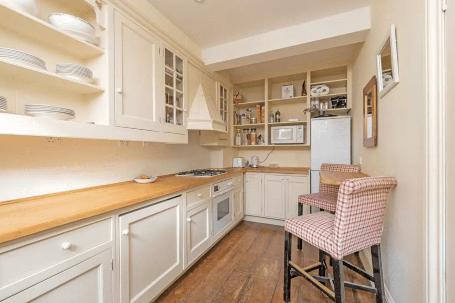 I must admit I don’t like the property at all. It lacks warmth and being cosy. Looks like your typical mews central London house. Nothing at all special. Ghastly kitchen layout. The tub also doesn’t look to small either!
