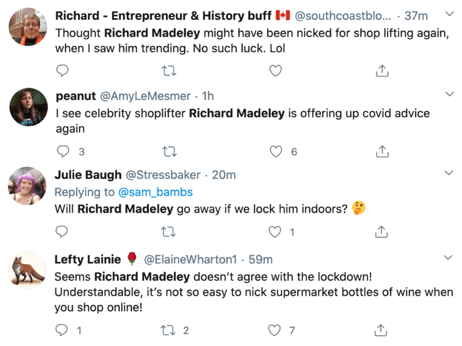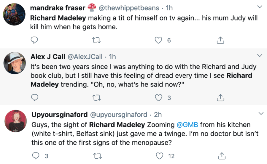 Whilst some might suggest ‘The Dorian Gray of Daytime Telly’ might actually have a point, his curious choice of words about sums up this all-round wally and on Twitter the public reacted with an understandable hint of mockery. Of his not so sage expertise, comments included: “What a plonker” and “his mum Judy will kill him when he gets home.” Another quite accurately added: “I still have this feeling of dread every time I see Richard Madeley trending. ‘Oh, no, what’s he said now?’”